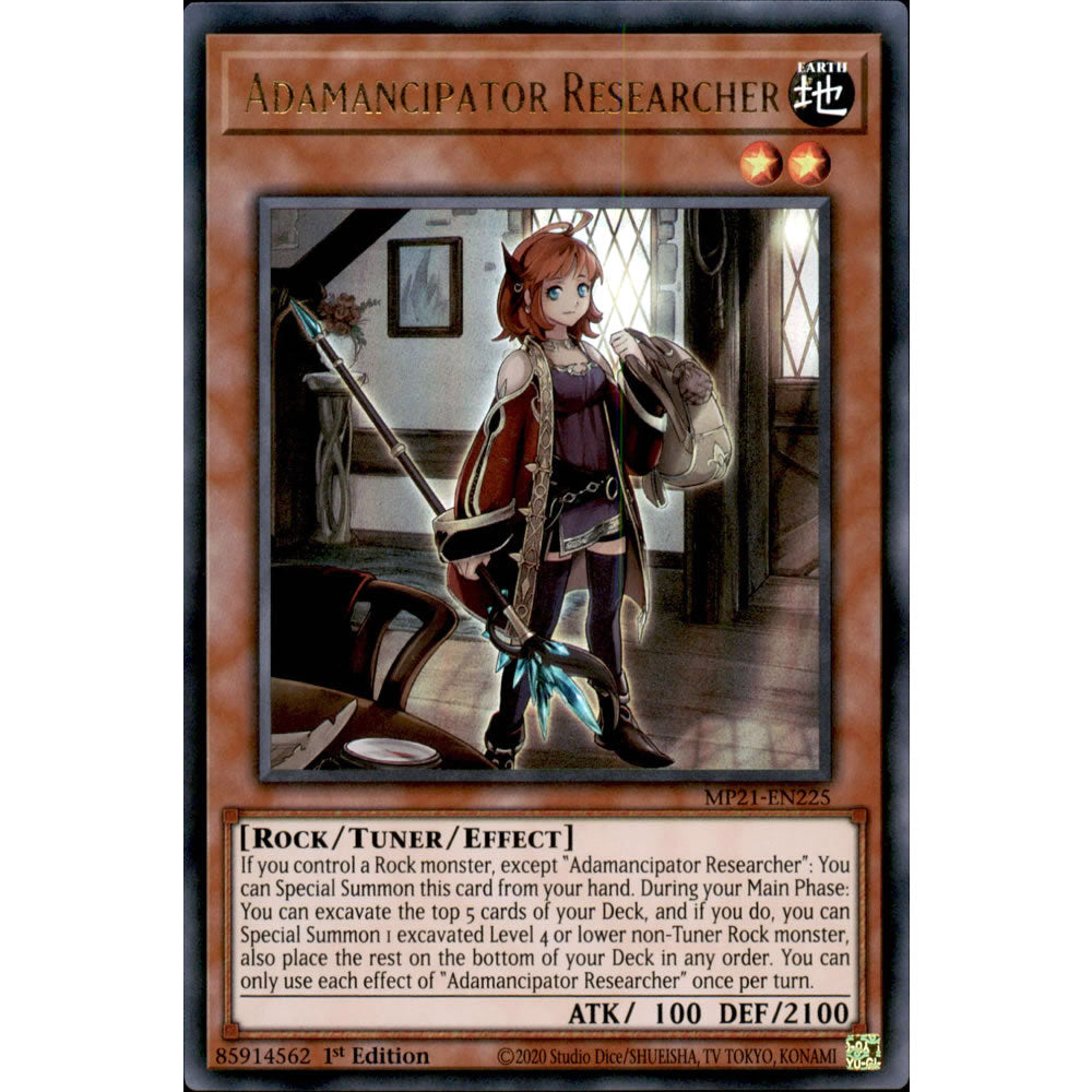 Card Text: If you control a Rock monster, except "Adamancipator Researcher": You can Special Summon this card from your hand. During your Main Phase: You can excavate the top 5 cards of your Deck, and if you do, you can Special Summon 1 excavated Level 4 or lower non-Tuner Rock monster, also place the rest on the bottom of your Deck in any order. You can only use each effect of "Adamancipator Researcher" once per turn.
