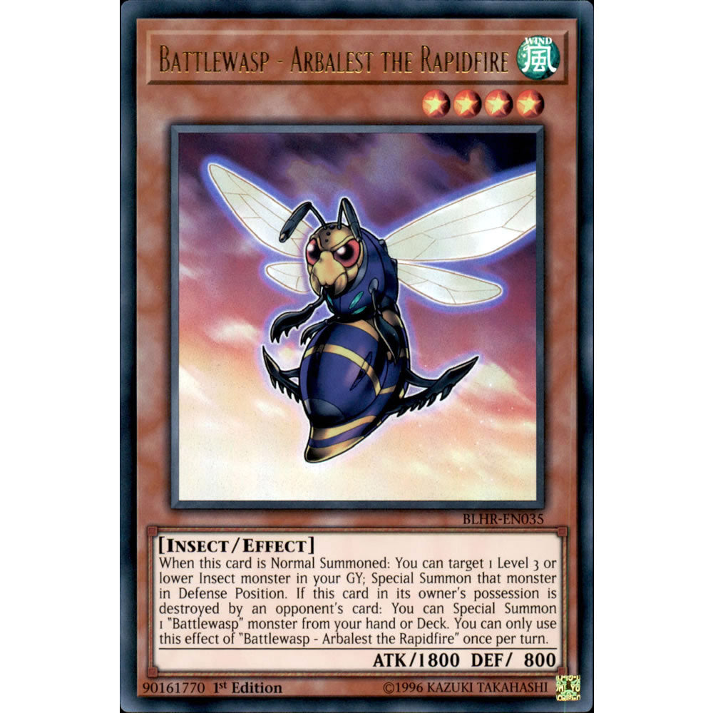 Card Text: When this card is Normal Summoned: You can target 1 Level 3 or lower Insect monster in your GY; Special Summon that monster in Defense Position. If this card in its owner's possession is destroyed by an opponent's card: You can Special Summon 1 "Battlewasp" monster from your hand or Deck. You can only use this effect of "Battlewasp - Arbalest the Rapidfire" once per turn.