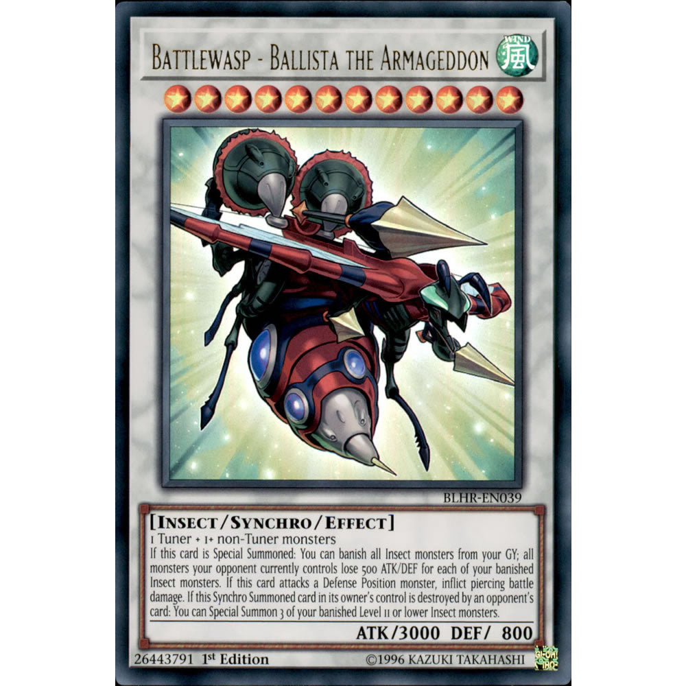 Card Text: 1 Tuner + 1+ non-Tuner monsters. If this card is Special Summoned: You can banish all Insect monsters from your GY; all monsters your opponent currently controls lose 500 ATK/DEF for each of your banished Insect monsters. If this card attacks a Defense Position monster, inflict piercing battle damage. If this Synchro Summoned card in its owner's control is destroyed by an opponent's card: You can Special Summon 3 of your banished Level 11 or lower Insect monsters.