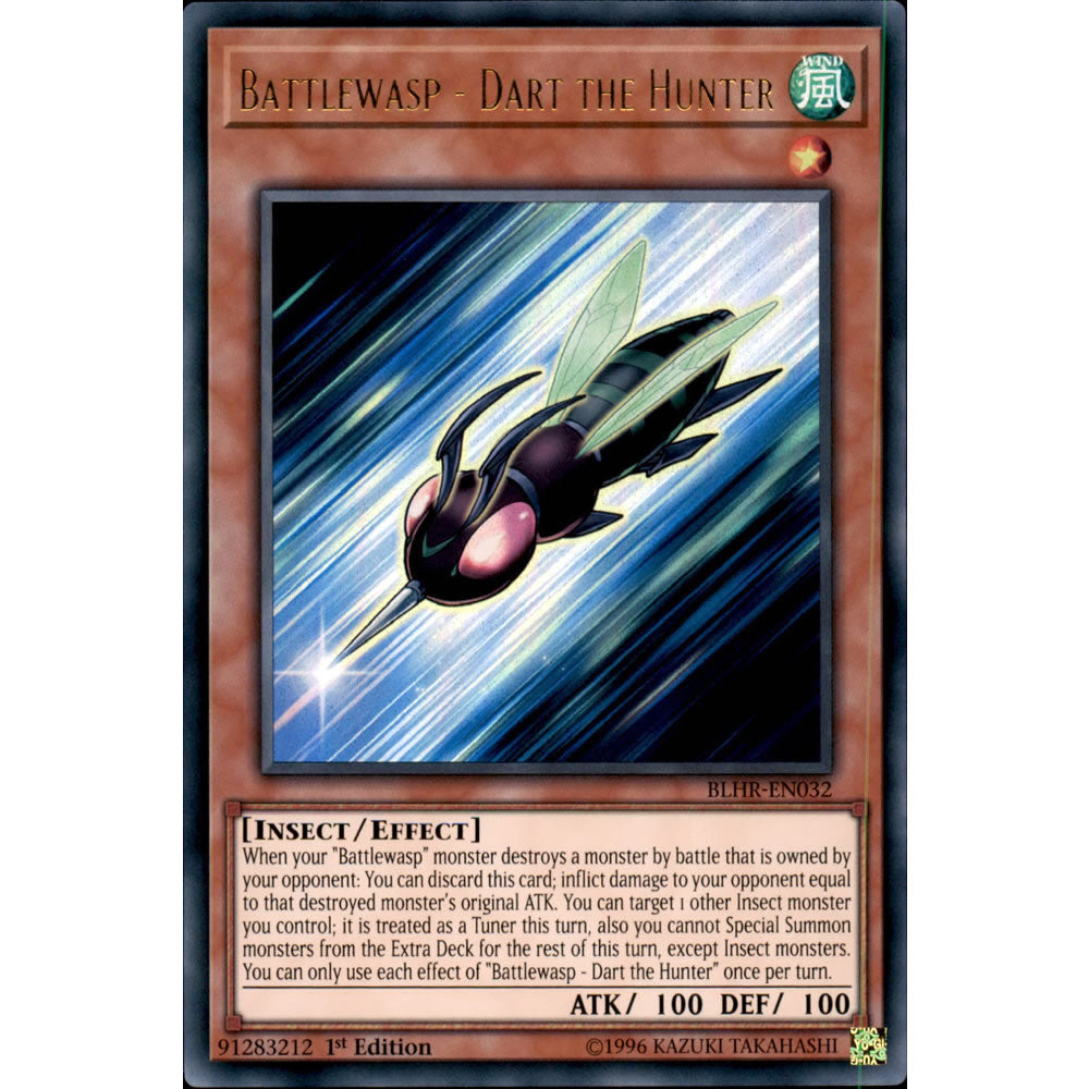 Card Text: When your "Battlewasp" monster destroys a monster by battle that is owned by your opponent: You can discard this card; inflict damage to your opponent equal to that destroyed monster's original ATK. You can target 1 other Insect monster you control; it is treated as a Tuner this turn, also you cannot Special Summon monsters from the Extra Deck for the rest of this turn, except Insect monsters. You can only use each effect of "Battlewasp - Dart the Hunter" once per turn.