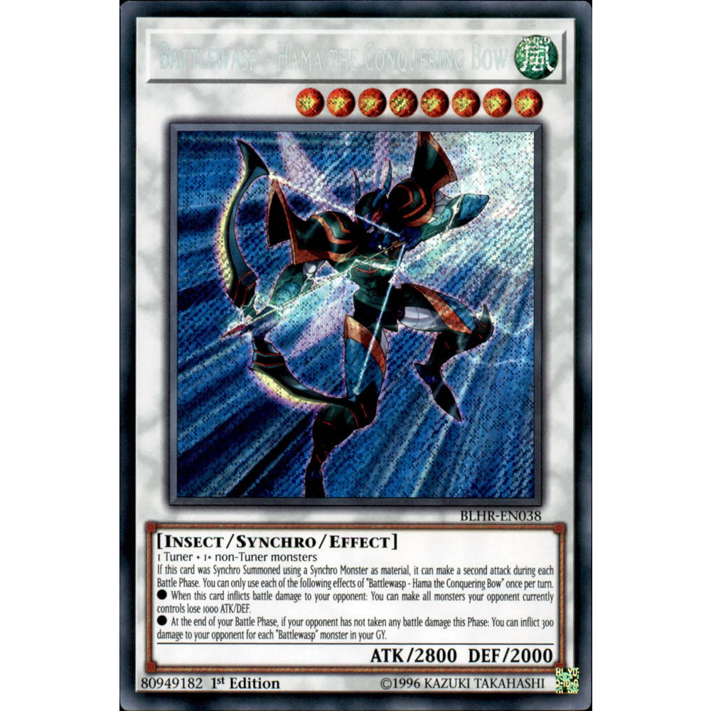Card Text: 1 Tuner + 1+ non-Tuner monsters. If this card was Synchro Summoned using a Synchro Monster as material, it can make a second attack during each Battle Phase. You can only use each of the following effects of "Battlewasp - Hama the Conquering Bow" once per turn. :- When this card inflicts battle damage to your opponent: You can make all monsters your opponent currently controls lose 1000 ATK/DEF. :- At the end of your Battle Phase, if your opponent has not taken any battle damage this Phase: You can inflict 300 damage to your opponent for each "Battlewasp" monster in your GY.