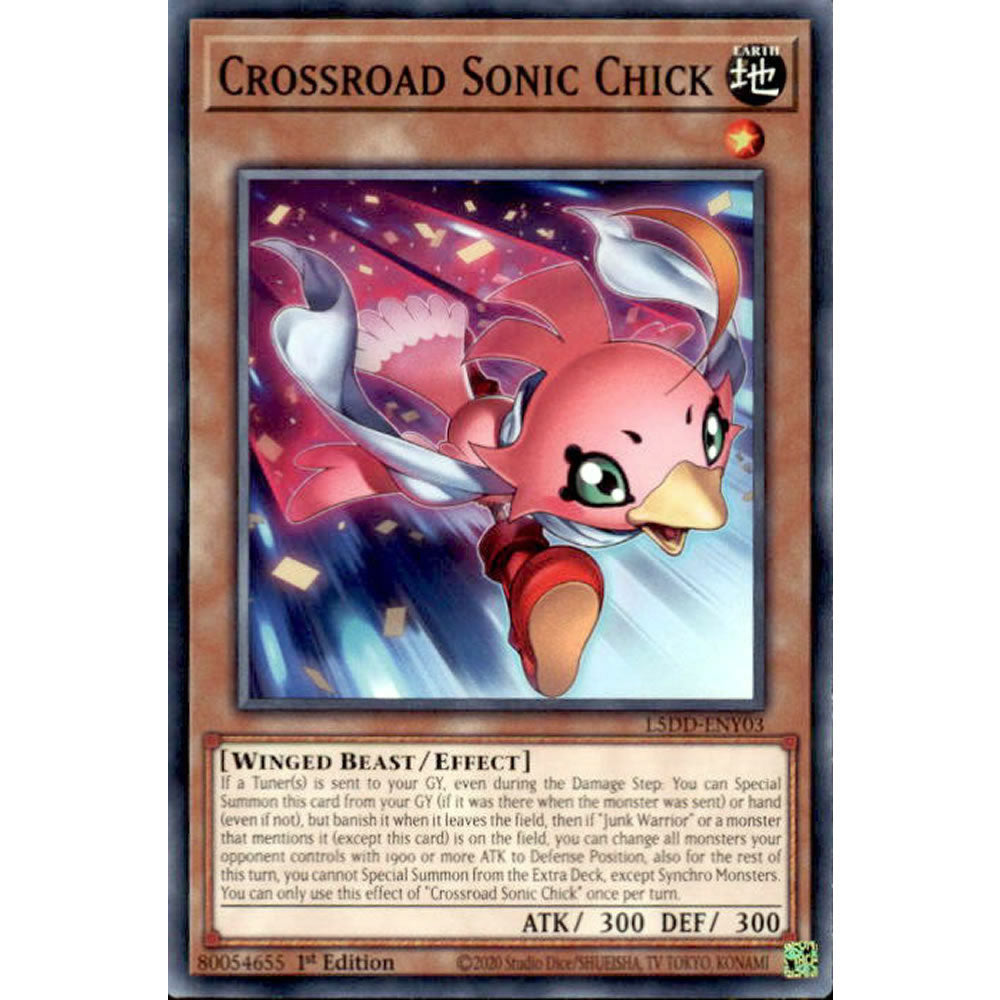 Card Text: If a Tuner(s) is sent to your GY, even during the Damage Step: You can Special Summon this card from your GY (if it was there when the monster was sent) or hand (even if not), but banish it when it leaves the field, then if "Junk Warrior" or a monster that mentions it (except this card) is on the field, you can change all monsters your opponent controls with 1900 or more ATK to Defense Position, also for the rest of this turn, you cannot Special Summon from the Extra Deck, except Synchro Monsters. You can only use this effect of "Crossroad Sonic Chick" once per turn.
