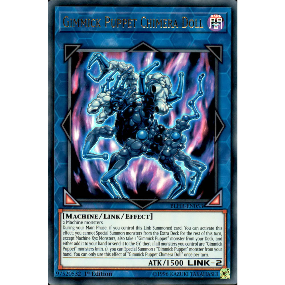 Card Text: 2 Machine monsters. During your Main Phase, if you control this Link Summoned card: You can activate this effect; you cannot Special Summon monsters from the Extra Deck for the rest of this turn, except Machine Xyz Monsters, also take 1 "Gimmick Puppet" monster from your Deck, and either add it to your hand or send it to the GY, then, if all monsters you control are "Gimmick Puppet" monsters (min. 1), you can Special Summon 1 "Gimmick Puppet" monster from your hand. You can only use this effect of "Gimmick Puppet Chimera Doll" once per turn.
