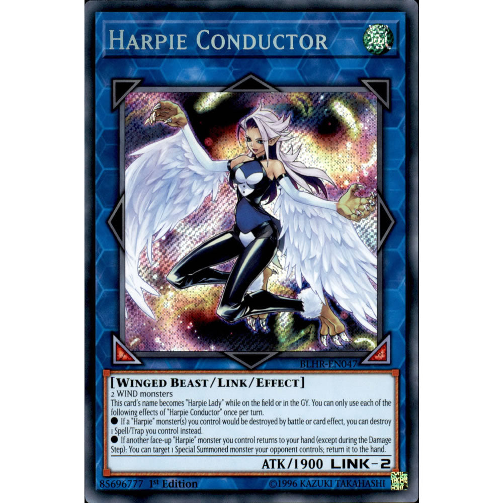 Card Text: 2 WIND monsters. This card's name becomes "Harpie Lady" while on the field or in the GY. You can only use each of the following effects of "Harpie Conductor" once per turn. :- If a "Harpie" monster(s) you control would be destroyed by battle or card effect, you can destroy 1 Spell/Trap you control instead. :- If another face-up "Harpie" monster you control returns to your hand (except during the Damage Step): You can target 1 Special Summoned monster your opponent controls; return it to the hand.