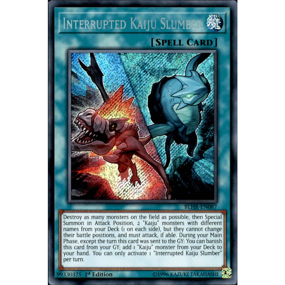 Card Text: Destroy as many monsters on the field as possible, then Special Summon in Attack Position, 2 "Kaiju" monsters with different names from your Deck (1 on each side), but they cannot change their battle positions, and must attack, if able. During your Main Phase, except the turn this card was sent to the Graveyard: You can banish this card from your Graveyard; add 1 "Kaiju" monster from your Deck to your hand. You can only activate 1 "Interrupted Kaiju Slumber" per turn.