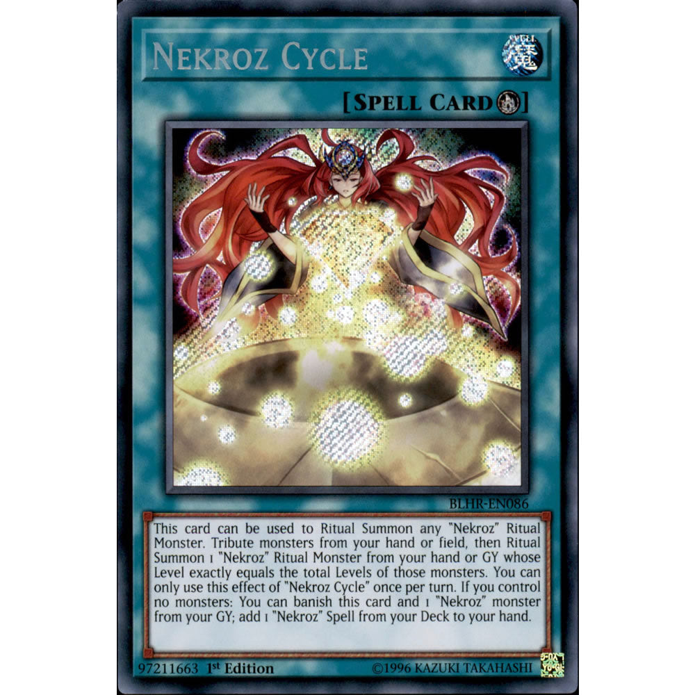 Card Text: This card can be used to Ritual Summon any "Nekroz" Ritual Monster. Tribute monsters from your hand or field, then Ritual Summon 1 "Nekroz" Ritual Monster from your hand or Graveyard whose Level exactly equals the total Levels of those monsters. You can only use this effect of "Nekroz Cycle" once per turn. If you control no monsters: You can banish this card and 1 "Nekroz" monster from your Graveyard; add 1 "Nekroz" Spell Card from your Deck to your hand.