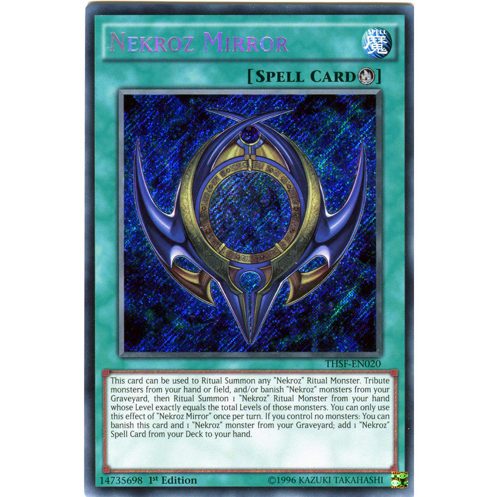 Card Text: This card can be used to Ritual Summon any "Nekroz" Ritual Monster. Tribute monsters from your hand or field, and/or banish "Nekroz" monsters from your Graveyard, then Ritual Summon 1 "Nekroz" Ritual Monster from your hand whose Level exactly equals the total Levels of those monsters. You can only use this effect of "Nekroz Mirror" once per turn. If you control no monsters: You can banish this card and 1 "Nekroz" monster from your Graveyard; add 1 "Nekroz" Spell Card from your Deck to your hand.