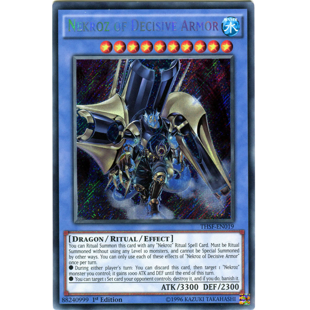 Card Text: You can Ritual Summon this card with any "Nekroz" Ritual Spell Card. Must be Ritual Summoned without using any Level 10 monsters, and cannot be Special Summoned by other ways. You can only use each of these effects of "Nekroz of Decisive Armor" once per turn. :- During either player's turn: You can discard this card, then target 1 "Nekroz" monster you control; it gains 1000 ATK and DEF until the end of this turn. :- You can target 1 Set card your opponent controls; destroy it, and if you do, banish it.