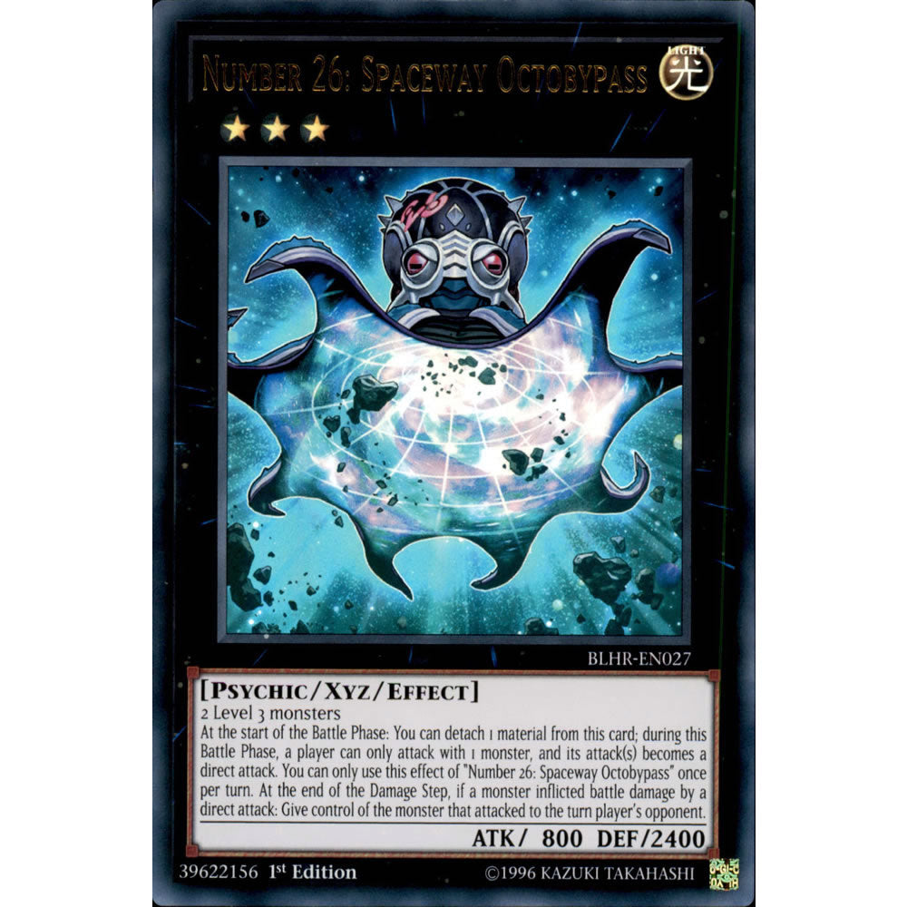 Card Text: 2 Level 3 monsters. At the start of the Battle Phase: You can detach 1 material from this card; during this Battle Phase, a player can only attack with 1 monster, and its attack(s) becomes a direct attack. You can only use this effect of "Number 26: Spaceway Octobypass" once per turn. At the end of the Damage Step, if a monster inflicted battle damage by a direct attack: Give control of the monster that attacked to the turn player's opponent.