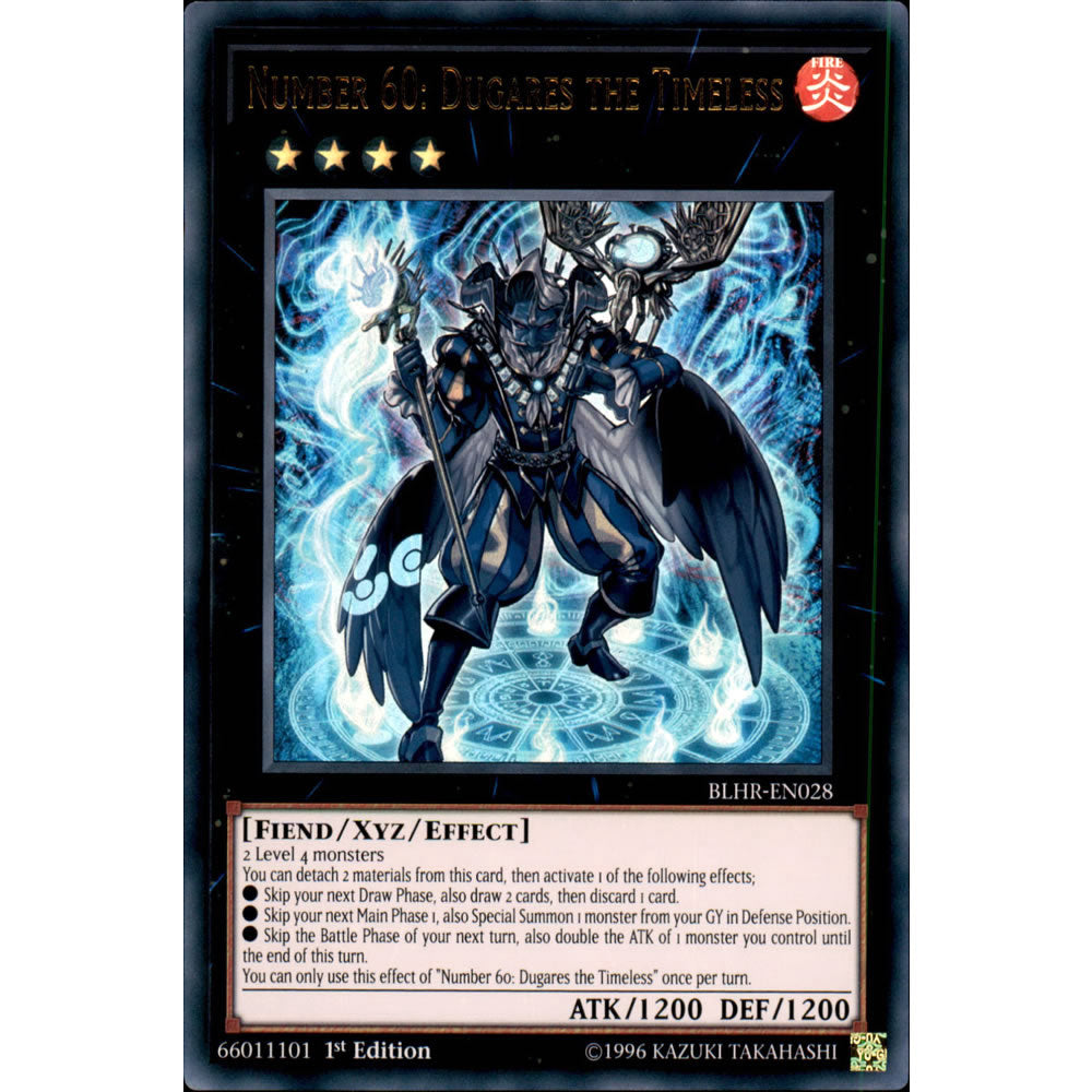 Card Text: 2 Level 4 monsters. You can detach 2 materials from this card, then activate 1 of the following effects; Skip your next Draw Phase, also draw 2 cards, then discard 1 card. :- Skip your next Main Phase 1, also Special Summon 1 monster from your GY in Defense Position. : Skip the Battle Phase of your next turn, also double the ATK of 1 monster you control until the end of this turn. You can only use this effect of "Number 60: Dugares the Timeless" once per turn.