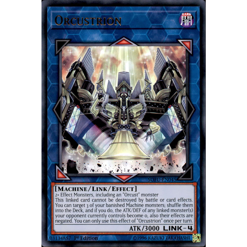 Card Text: 2+ Effect Monsters, including an Orcust monster. This linked card cannot be destroyed by battle or card effects. You can target 3 of your banished Machine monsters; return them to the Deck, and if you do, the ATK/DEF of any linked monster(s) your opponent currently controls becomes 0, also their effects are negated. You can only use this effect of "Orcustrion" once per turn.