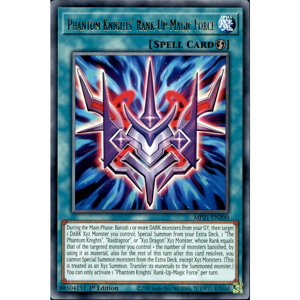 Card Text: During the Main Phase: Banish 1 or more DARK monsters from your GY, then target 1 DARK Xyz Monster you control; Special Summon from your Extra Deck, 1 "The Phantom Knights", "Raidraptor", or "Xyz Dragon" Xyz Monster, whose Rank equals that of the targeted monster you control + the number of monsters banished, by using it as material, also for the rest of this turn after this card resolves, you cannot Special Summon monsters from the Extra Deck, except Xyz Monsters. (This is treated as an Xyz Summon. Transfer its materials to the Summoned monster.) You can only activate 1 "Phantom Knights' Rank-Up-Magic Force" per turn.