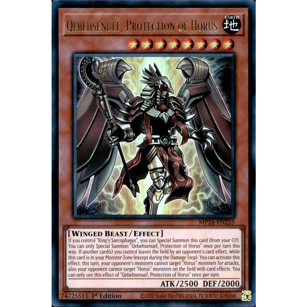 Card Text: If you control "King's Sarcophagus", you can Special Summon this card (from your GY). You can only Special Summon "Qebehsenuef, Protection of Horus" once per turn this way. If another card(s) you control leaves the field by an opponent's card effect, while this card is in your Monster Zone (except during the Damage Step): You can activate this effect; this turn, your opponent's monsters cannot target "Horus" monsters for attacks, also your opponent cannot target "Horus" monsters on the field with card effects. You can only use this effect of "Qebehsenuef, Protection of Horus" once per turn.