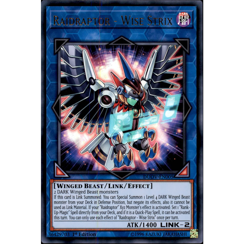 Card Text: 2 DARK Winged Beast monsters. If this card is Link Summoned: You can Special Summon 1 Level 4 DARK Winged Beast monster from your Deck in Defense Position, but negate its effects, also it cannot be used as Link Material. If your "Raidraptor" Xyz Monster's effect is activated: Set 1 "Rank-Up-Magic" Spell directly from your Deck, and if it is a Quick-Play Spell, it can be activated this turn. You can only use each effect of "Raidraptor - Wise Strix" once per turn.