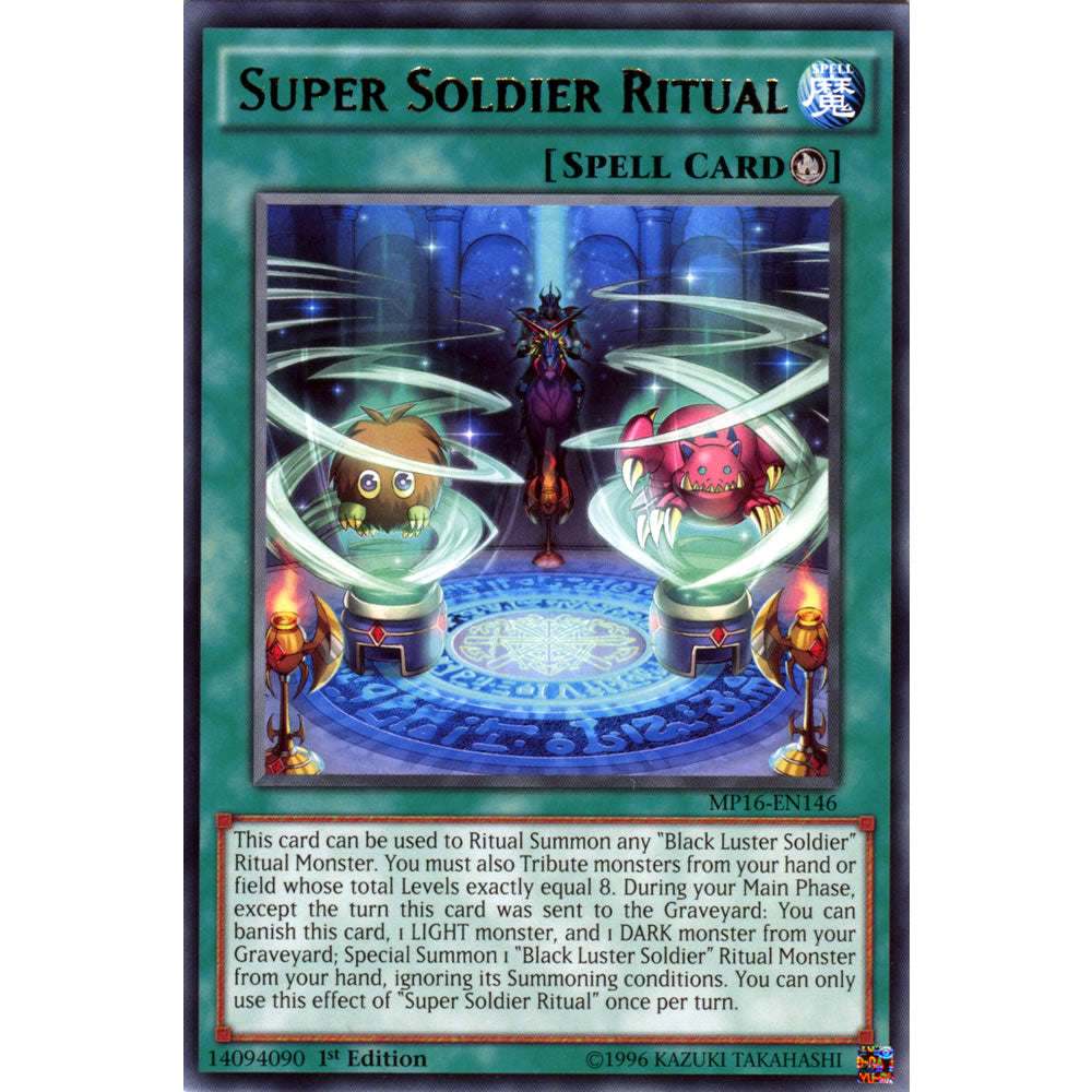 Card Text: This card can be used to Ritual Summon any "Black Luster Soldier" Ritual Monster. You must also Tribute monsters from your hand or field whose total Levels exactly equal 8. During your Main Phase, except the turn this card was sent to the Graveyard: You can banish this card, 1 LIGHT monster, and 1 DARK monster from your Graveyard; Special Summon 1 "Black Luster Soldier" Ritual Monster from your hand, ignoring its Summoning conditions. You can only use this effect of "Super Soldier Ritual" once per turn.