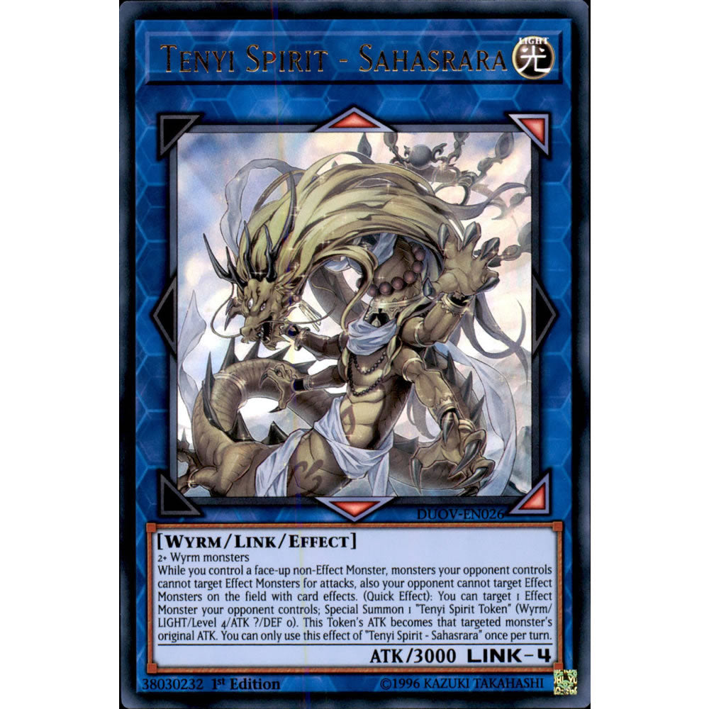 Card Text: 2+ Wyrm monsters. While you control a face-up non-Effect Monster, monsters your opponent controls cannot target Effect Monsters for attacks, also your opponent cannot target Effect Monsters on the field with card effects. (Quick Effect): You can target 1 Effect Monster your opponent controls; Special Summon 1 "Tenyi Spirit Token" (Wyrm/LIGHT/Level 4/ATK ?/DEF 0). This Token's ATK becomes that targeted monster's original ATK. You can only use this effect of "Tenyi Spirit - Sahasrara" once per turn.