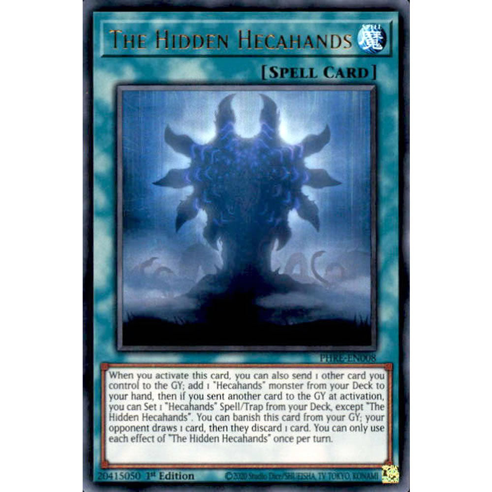 Card Text: When you activate this card, you can also send 1 other card you control to the GY; add 1 "Hecahands" monster from your Deck to your hand, then if you sent another card to the GY at activation, you can Set 1 "Hecahands" Spell/Trap from your Deck, except "The Hidden Hecahands". You can banish this card from your GY; your opponent draws 1 card, then they discard 1 card. You can only use each effect of "The Hidden Hecahands" once per turn.