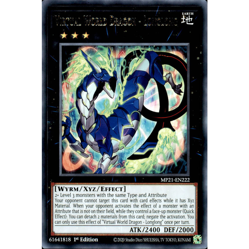 Card Text: 2+ Level 3 monsters with the same Type and Attribute. Your opponent cannot target this card with card effects while it has Xyz Material. When your opponent activates the effect of a monster with an Attribute that is not on their field, while they control a face-up monster (Quick Effect): You can detach 2 materials from this card; negate the activation. You can only use this effect of "Virtual World Dragon - Longlong" once per turn.