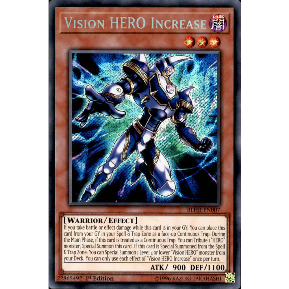 Card Text: If you take battle or effect damage while this card is in your GY: You can place this card from your GY in your Spell & Trap Zone as a face-up Continuous Trap. During the Main Phase, if this card is treated as a Continuous Trap: You can Tribute 1 "HERO" monster; Special Summon this card. If this card is Special Summoned from the Spell & Trap Zone: You can Special Summon 1 Level 4 or lower "Vision HERO" monster from your Deck. You can only use each effect of "Vision HERO Increase" once per turn.