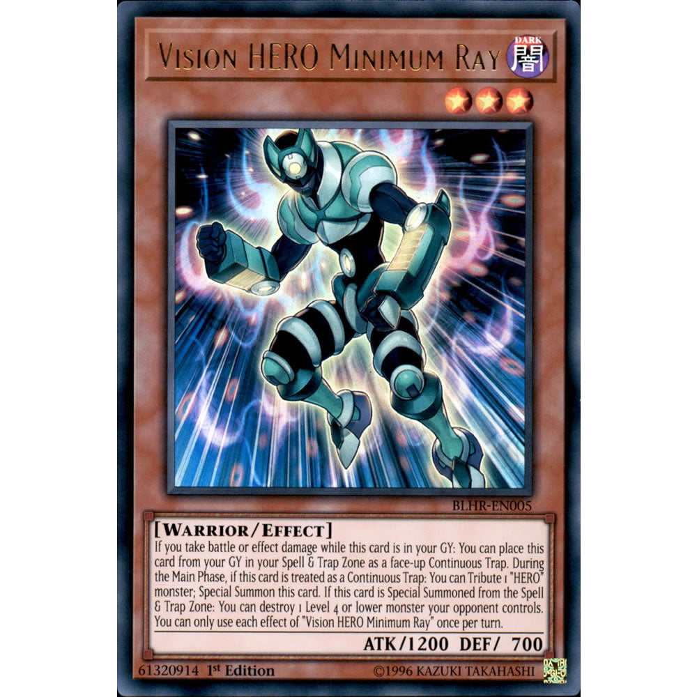 Card Text: If you take battle or effect damage while this card is in your GY: You can place this card from your GY in your Spell & Trap Zone as a face-up Continuous Trap. During the Main Phase, if this card is treated as a Continuous Trap: You can Tribute 1 "HERO" monster; Special Summon this card. If this card is Special Summoned from the Spell & Trap Zone: You can destroy 1 Level 4 or lower monster your opponent controls. You can only use each effect of "Vision HERO Minimum Ray" once per turn.