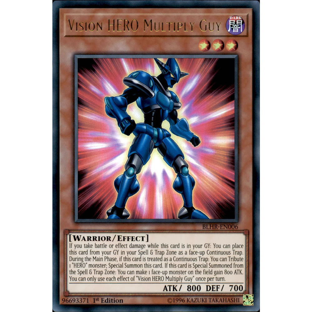 Card Text: If you take battle or effect damage while this card is in your GY: You can place this card from your GY in your Spell & Trap Zone as a face-up Continuous Trap. During the Main Phase, if this card is treated as a Continuous Trap: You can Tribute 1 "HERO" monster; Special Summon this card. If this card is Special Summoned from the Spell & Trap Zone: You can make 1 face-up monster on the field gain 800 ATK. You can only use each effect of "Vision HERO Multiply Guy" once per turn.